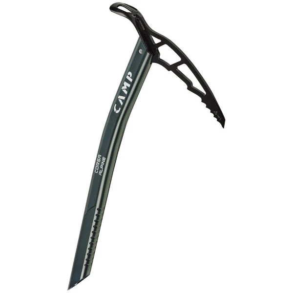 The Corsa Alpine is a new lightweight hybrid technical ice axe from Camp. This tool combines a technical chromoly steel head with a lightweight single-curve aluminum shaft. The pick is tapered to 3 mm for superior performance in ice and technical terrain. The end of the shaft has a plug to keep the snow and ice out when plunging, but does not have a traditional inset metal spike. The “grip” is machined into the shaft for added performance handling and provides a low profile and longer lasting durability when plunging then a traditional overlaid rubberized-style grip. This axe is well-suited to the needs of many advanced ski mountaineers and lightweight-oriented alpinists that often own a variety of different specific ice axes and tools so that they can always carry the most appropriate and functional tool for their particular mountain adventure of the day.