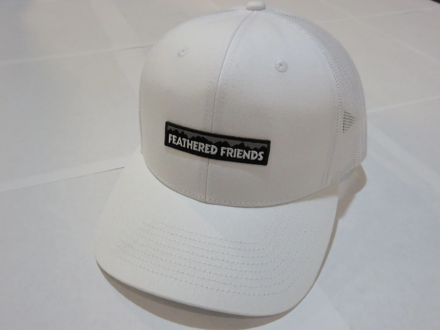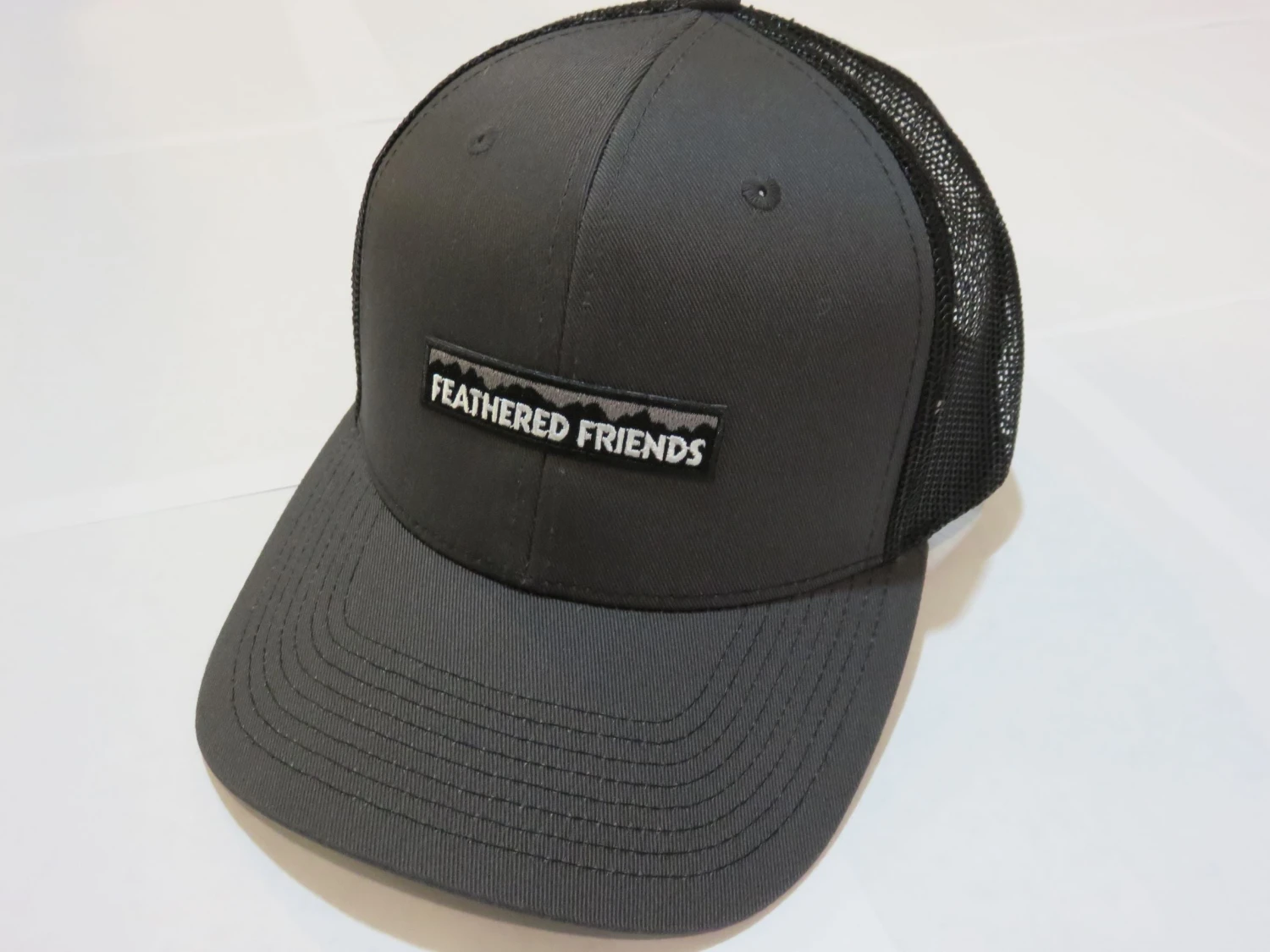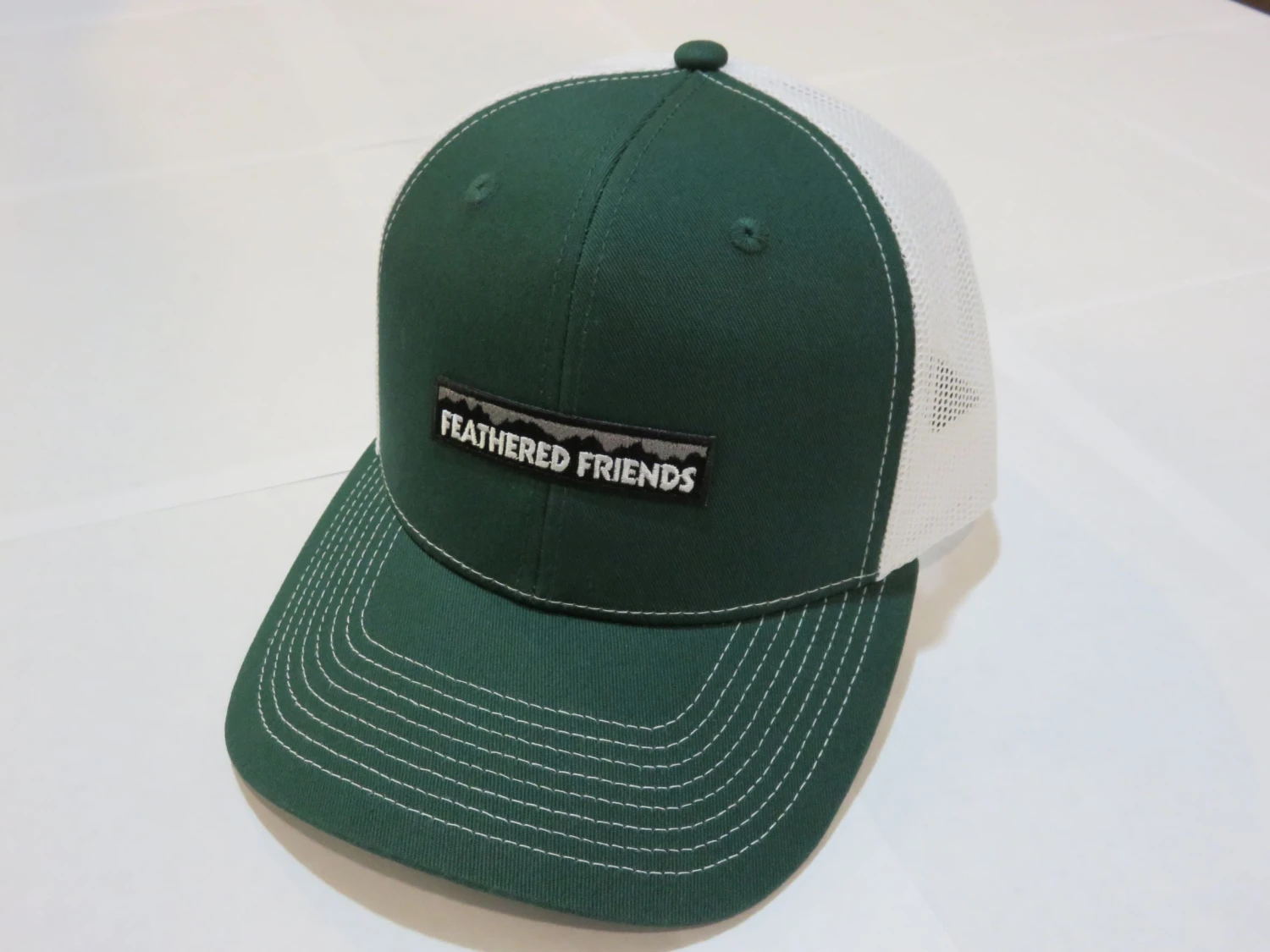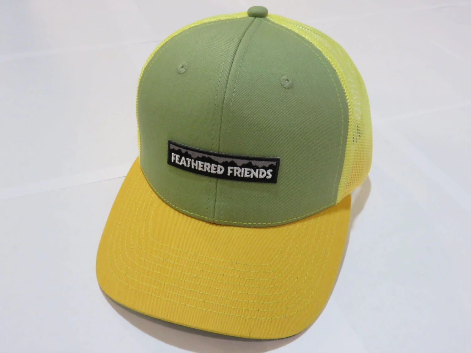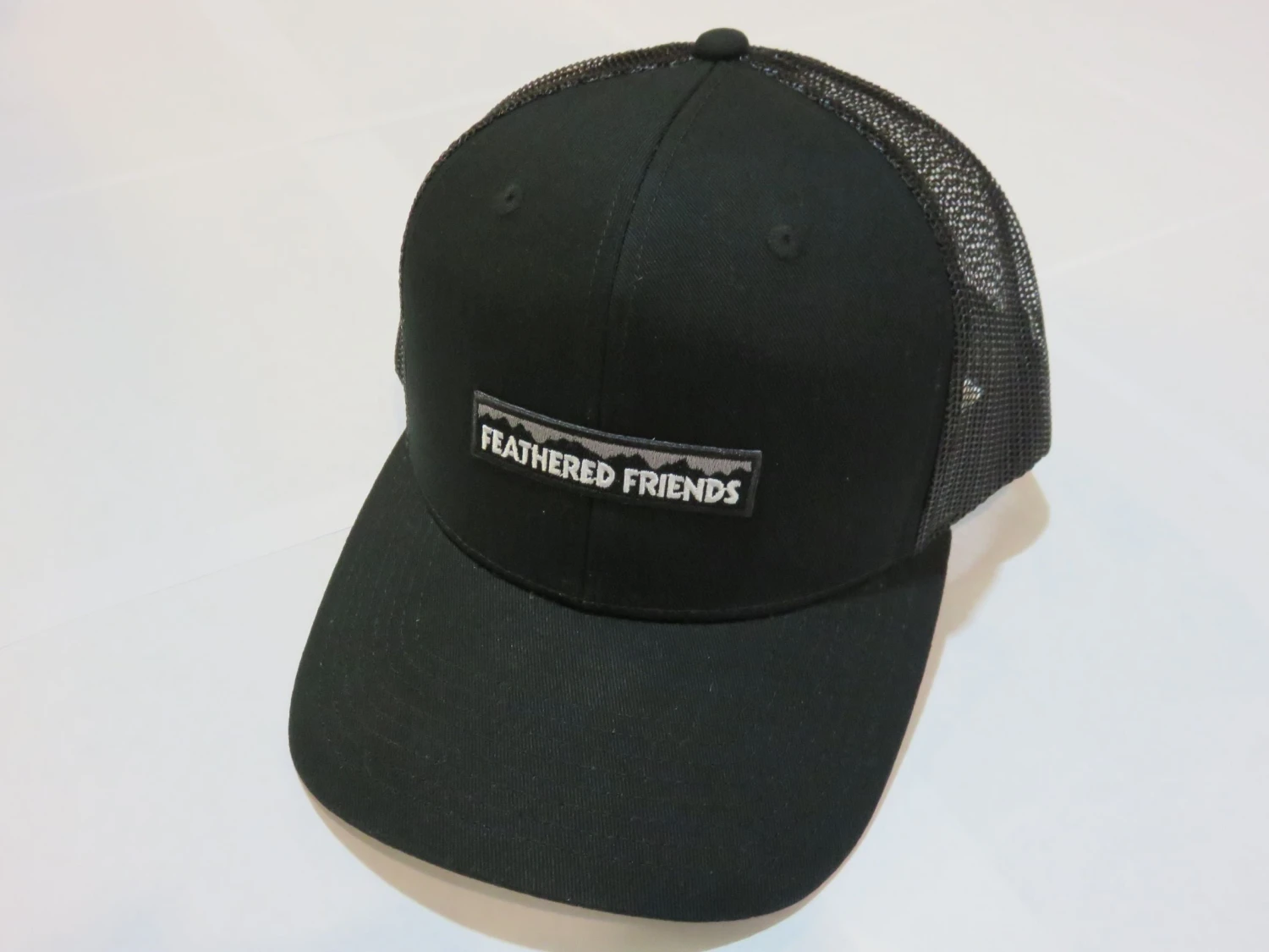 Classic Feathered Friends mountain logo made into an emboidered patch and sewn onto a mid-profile structured trucker hat with a mesh back. Plastic snap back closure fits a wide range of head sizes.