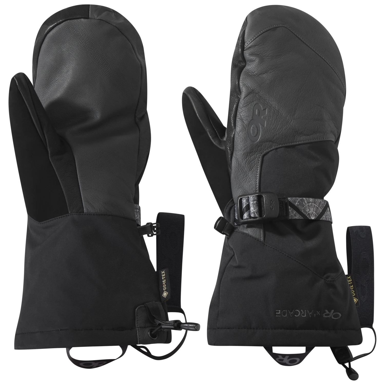 Another feature-packed great fitting pair of all-around fixed insulation mittens from Outdoor Research! These mittens have slightly more insulation in the back of the hand than in the palm to help balance dexterity with warmth, a GORE-TEX® insert for waterproof/breathable protection, a water resistant goat leather palm for durability, and a unique stretchy Arcade® elastic webbing wrist cinch for a customized secure fit.