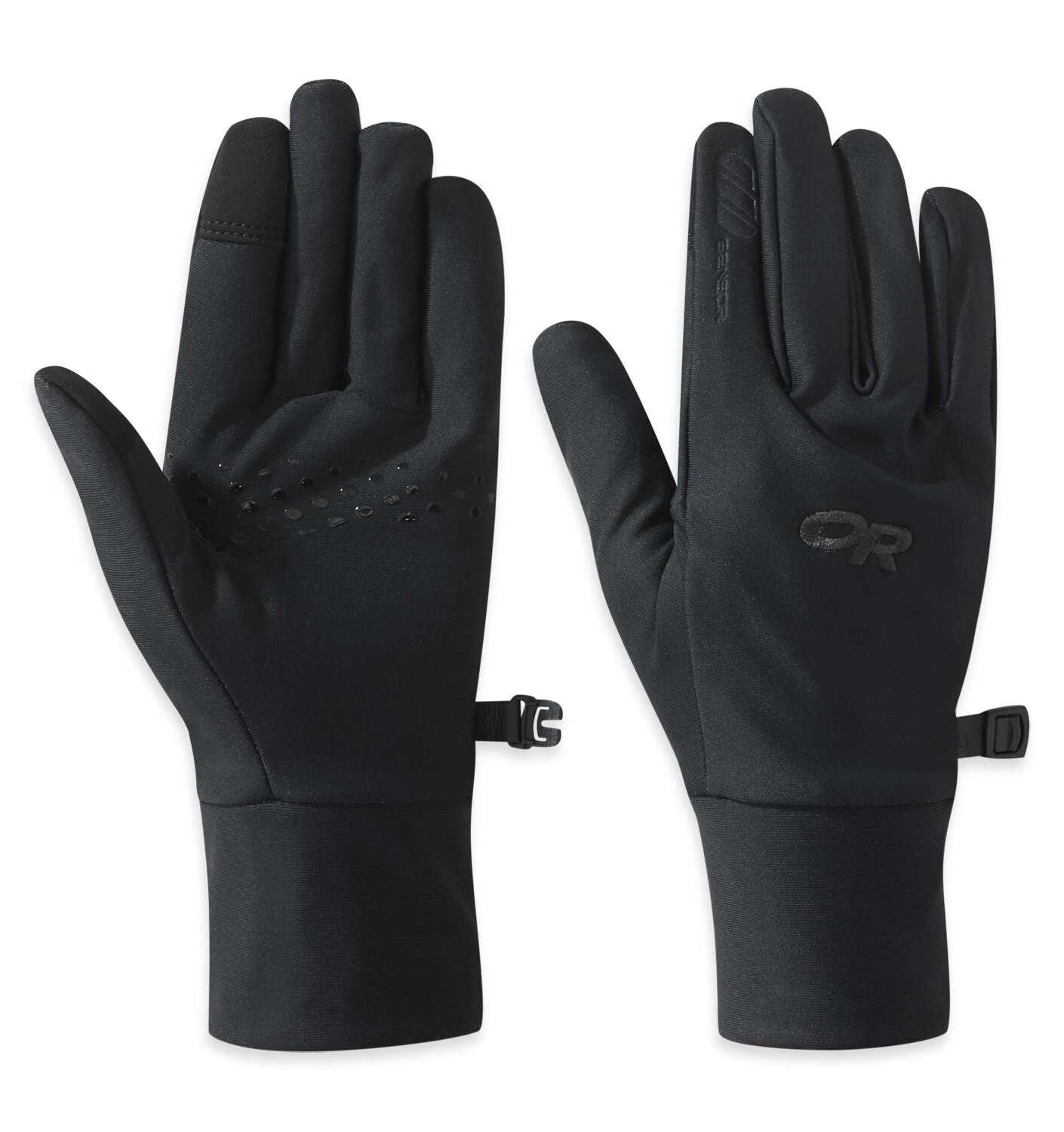 The thinnest and lightest weight form-fitting synthetic “liner” glove style from Outdoor Research. Made with ActiveTemp™ themo-regulating technology that adjusts to your level of exertion, sweat, and body temperature to actively control body heat and maintain an optimal comfort level. Includes an anti-slip silicone pad style palm grip as well as touchscreen compatible thumb and index fingertips. Use as a standalone lightweight glove or as a liner inside of mittens or appropriately sized warmer gloves.