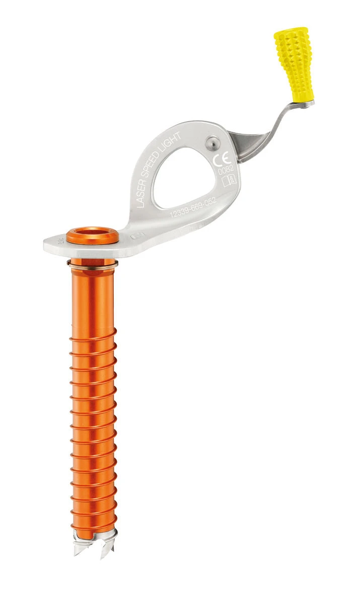 Ultra-light ice screws with integrated crank from Petzl. The main tube of the screw is made of aluminum to save weight, but the end of the tube where the “teeth” are is made of steel. The crank helps make it faster and easier to place the screws, and folds in for a more compact profile while carried. Color coded by length for easy identification.